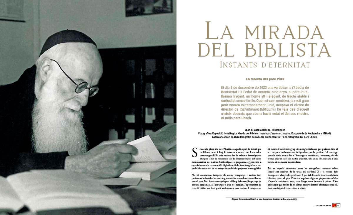 El dia 8 de desembre de 2023 ens va deixar, a l’Abadia de Montserrat i a l’edat de noranta-cinc anys, el pare Pius-Ramon Tragant, un home alt i elegant, de tracte afable i curiositat sense límits. Quan el vam conèixer, ja molt gran però encara extremadament lúcid, ocupava el càrrec de director de l’Scriptorium Biblicum i ho feia des d’aquell mateix despatx que abans havia estat el del seu mestre, el mític pare Ubach.