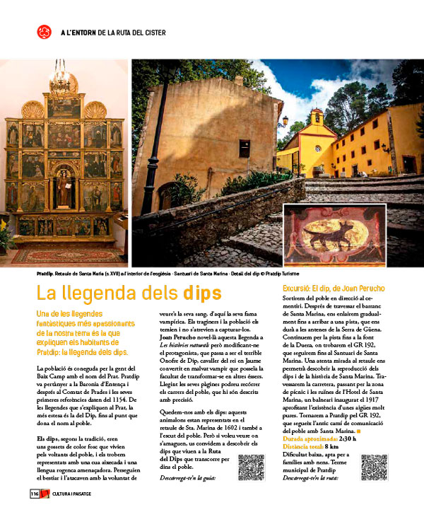Sota l’atenta mirada dels dips (vigileu si se us fa de nit!) sortirem del poble en direcció al cementiri. Després de travessar el barranc de Santa Marina, ens enlairem gradualment fins a arribar a una pista, que ens durà a les antenes de la Serra de Güena. Continuem per la pista fins a la font de la Duera, on trobarem el GR*, que seguirem fins al Santuari de Santa Marina. Una atenta mirada al retaule ens permetrà descobrir la reproducció dels dips i de la història de Santa Marina. Travessarem la carretera, passant per la zona de pícnic i les ruïnes de l’Hotel de Santa Marina, un balneari inaugurat el 1917 aprofitant l’existència d’unes aigües molt pures. Tornarem a Pratdip pel GR*, que segueix l’antic camí de comunicació del poble amb Santa Marina, per on es fa la tradicional romeria durant la festa major.
